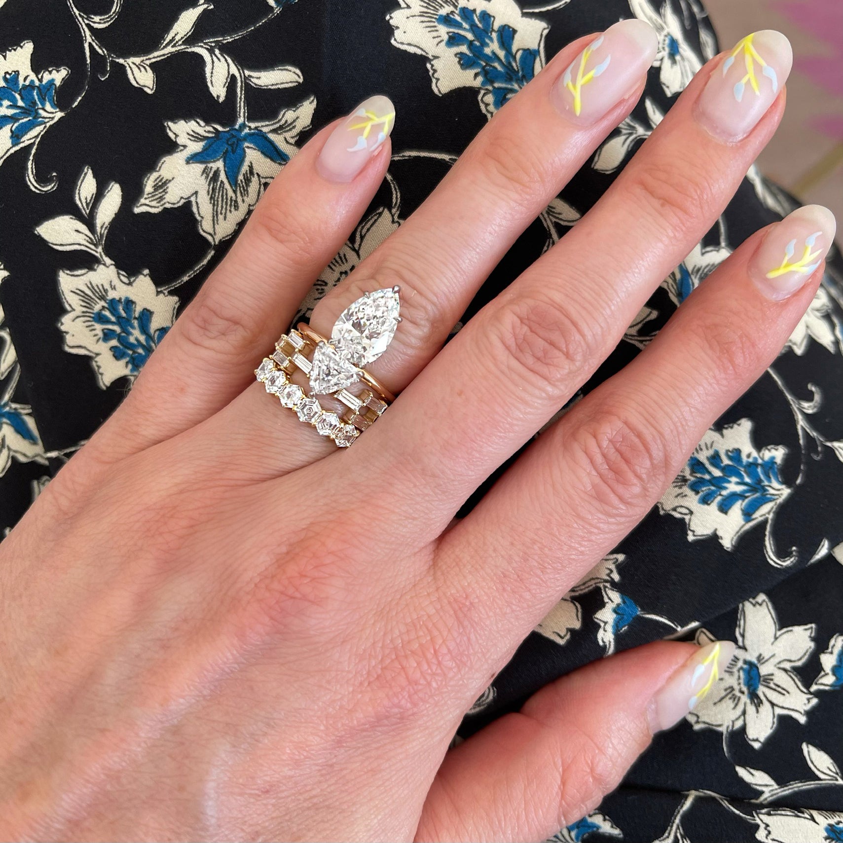 "This ring can be purchased as a complete band or as a spacer band with a gap to allow negative space for an engagement ring. On both versions, baguette diamonds are set on the front half of the ring. Please email inquiries@k-kane.com if interested in having diamonds set all the way around the ring.