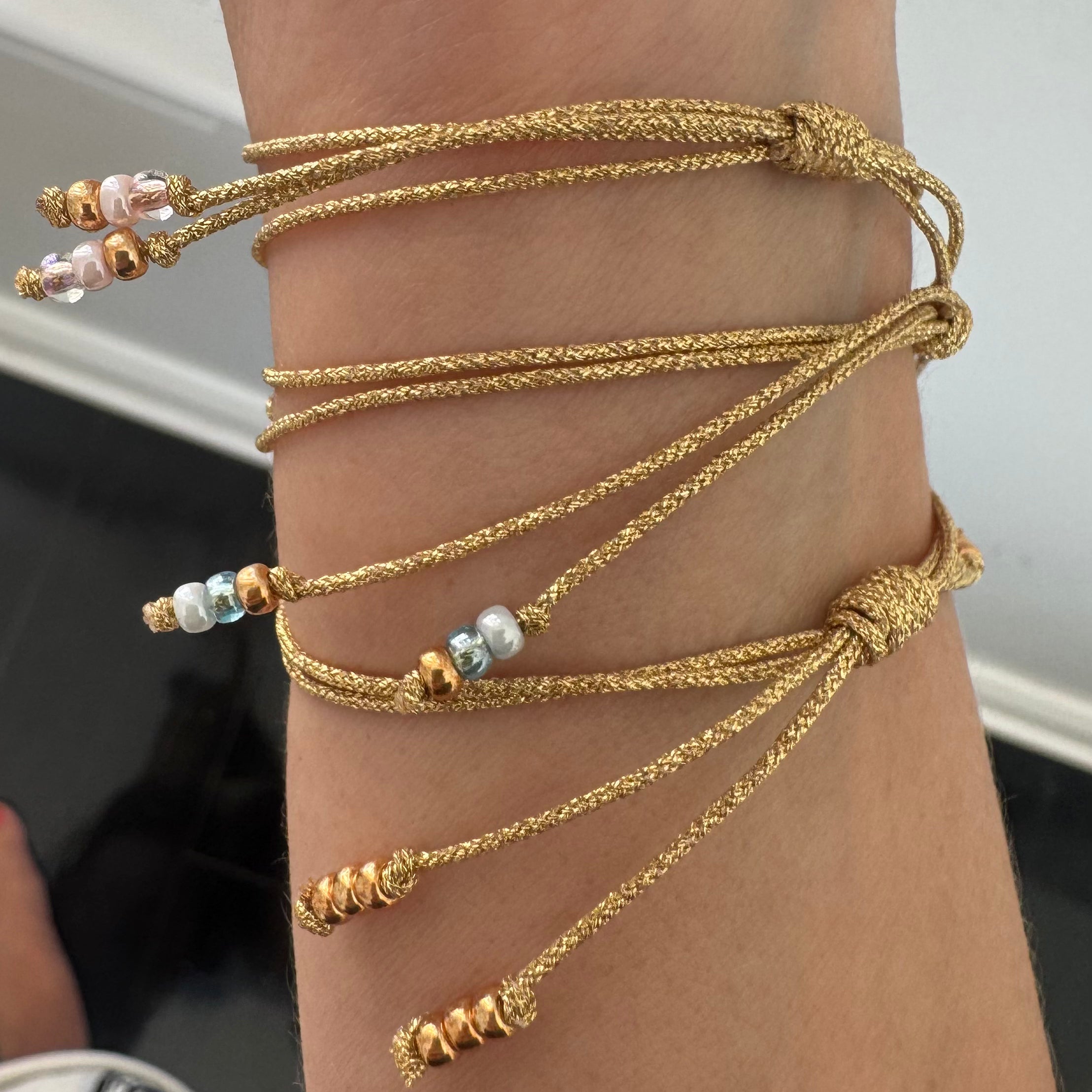 Chain Letter Cords are BACK and better than ever!! Our iconic 14k gold Chain Letters - knotted on luxe golden cord and finished with shimmering glass beads.