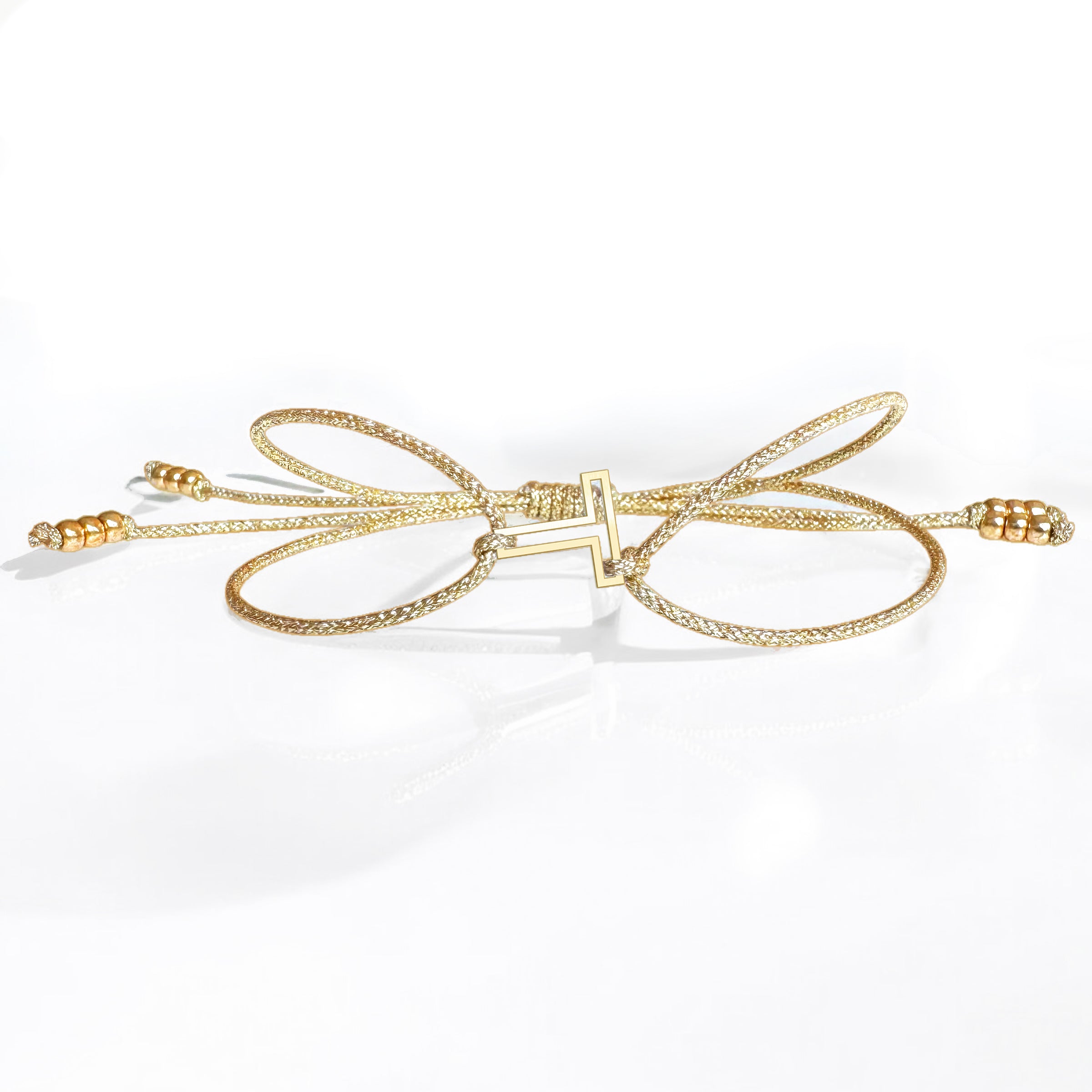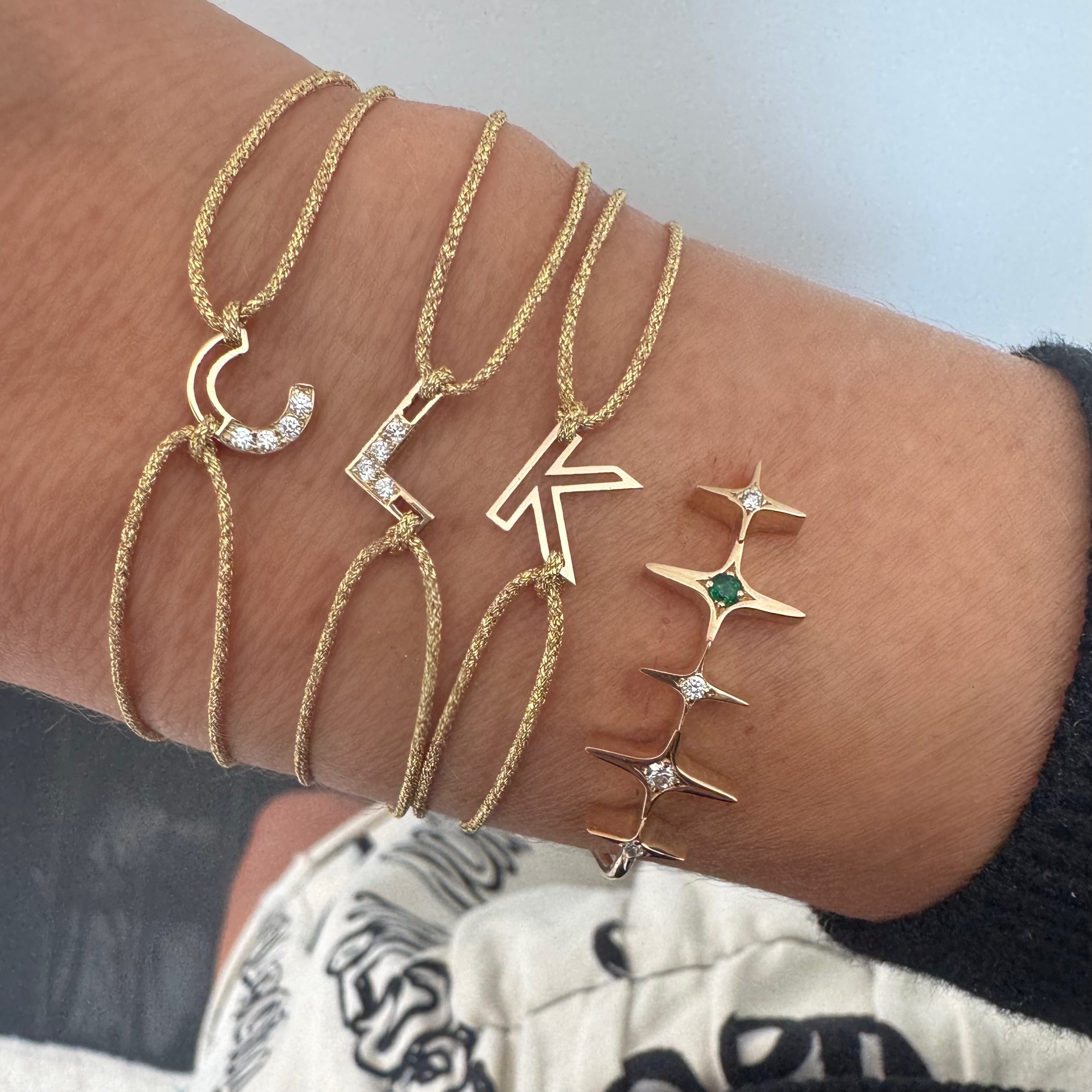 Solid 14k gold letter. Adjustable sliding knot closure opens up to 9" to pass over hand.