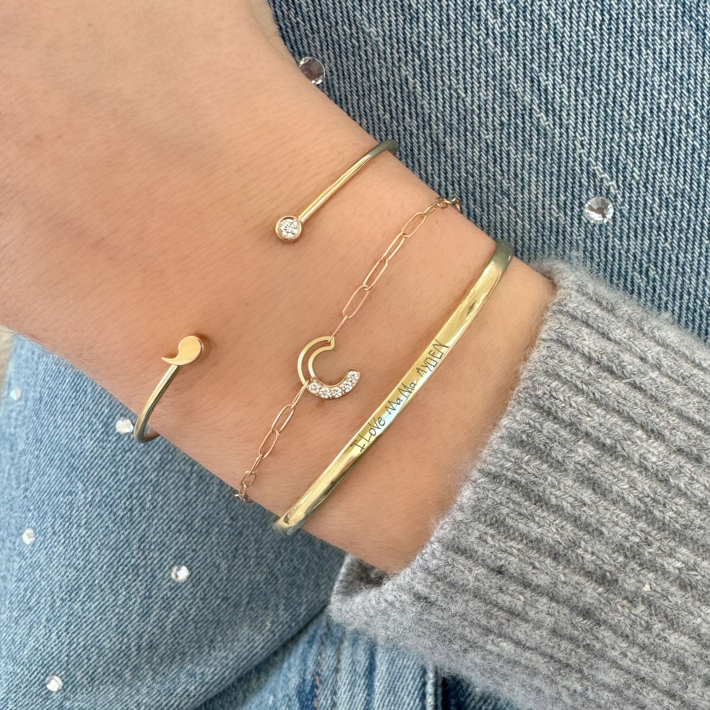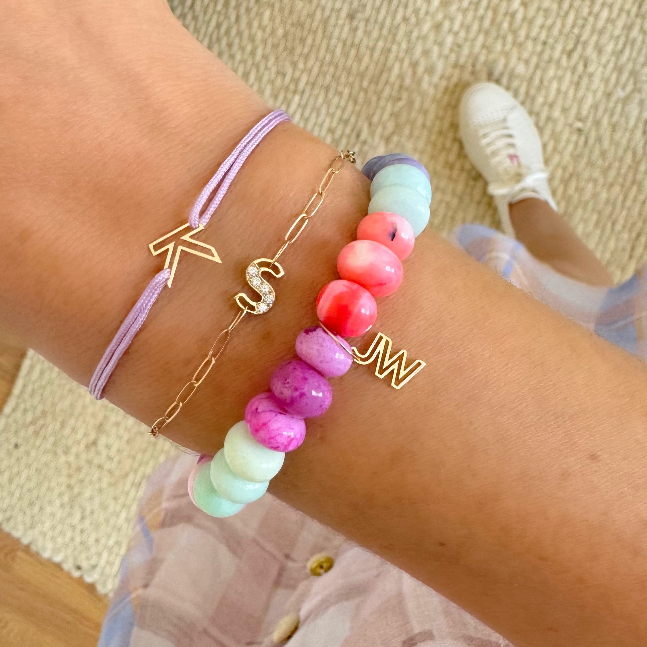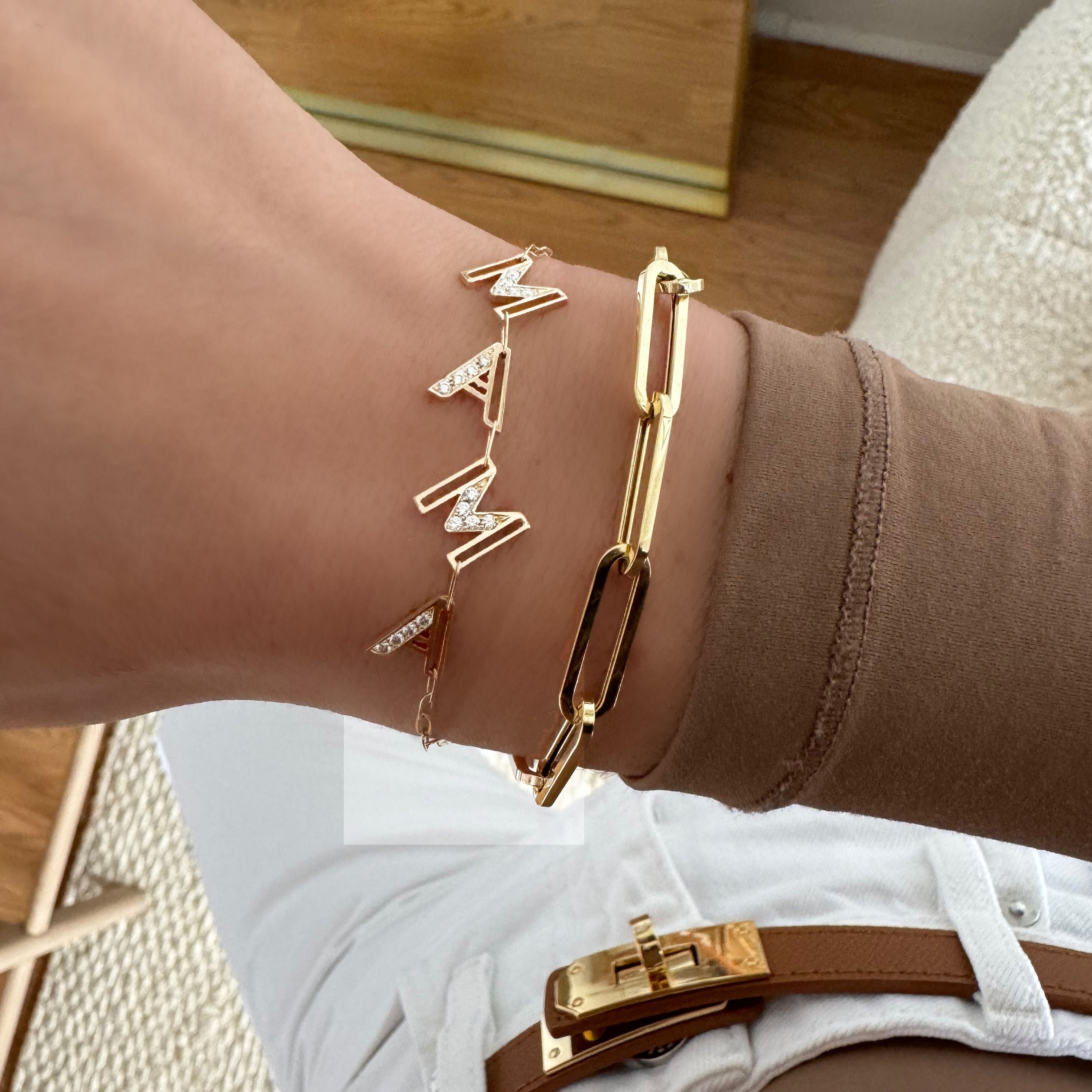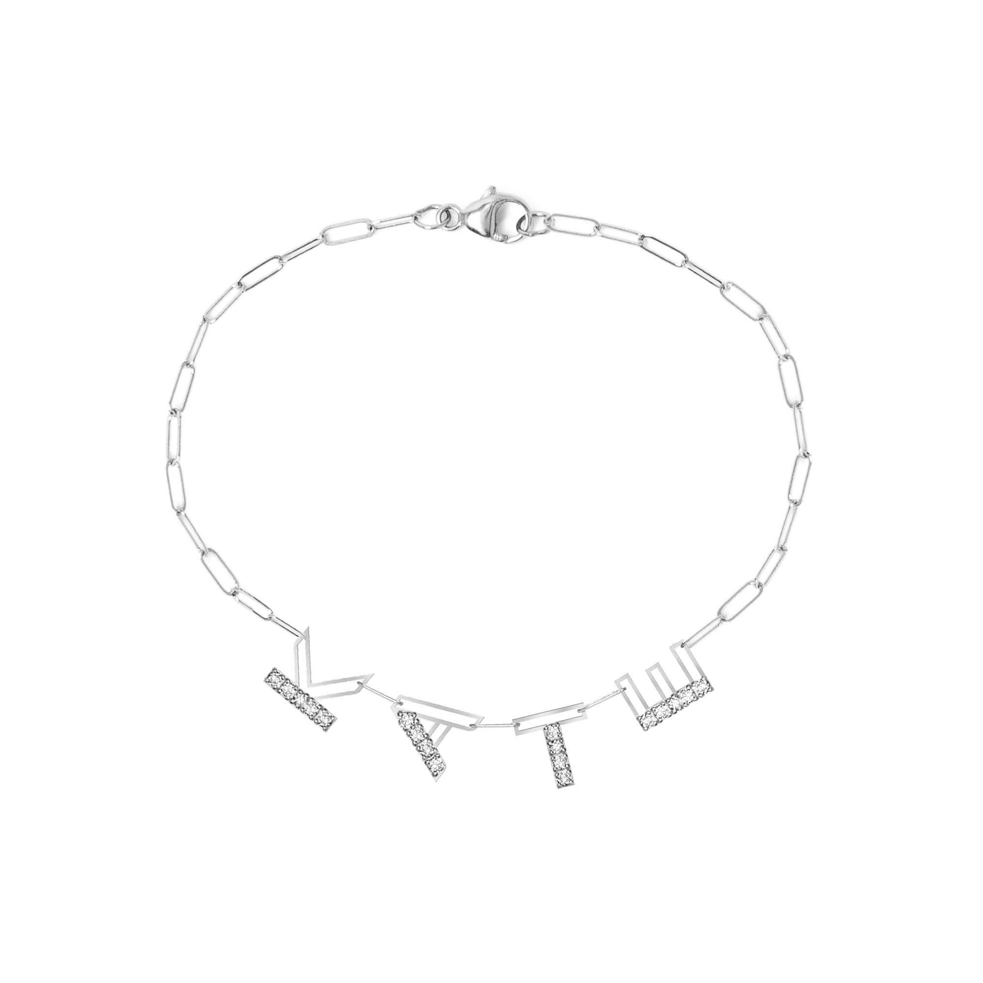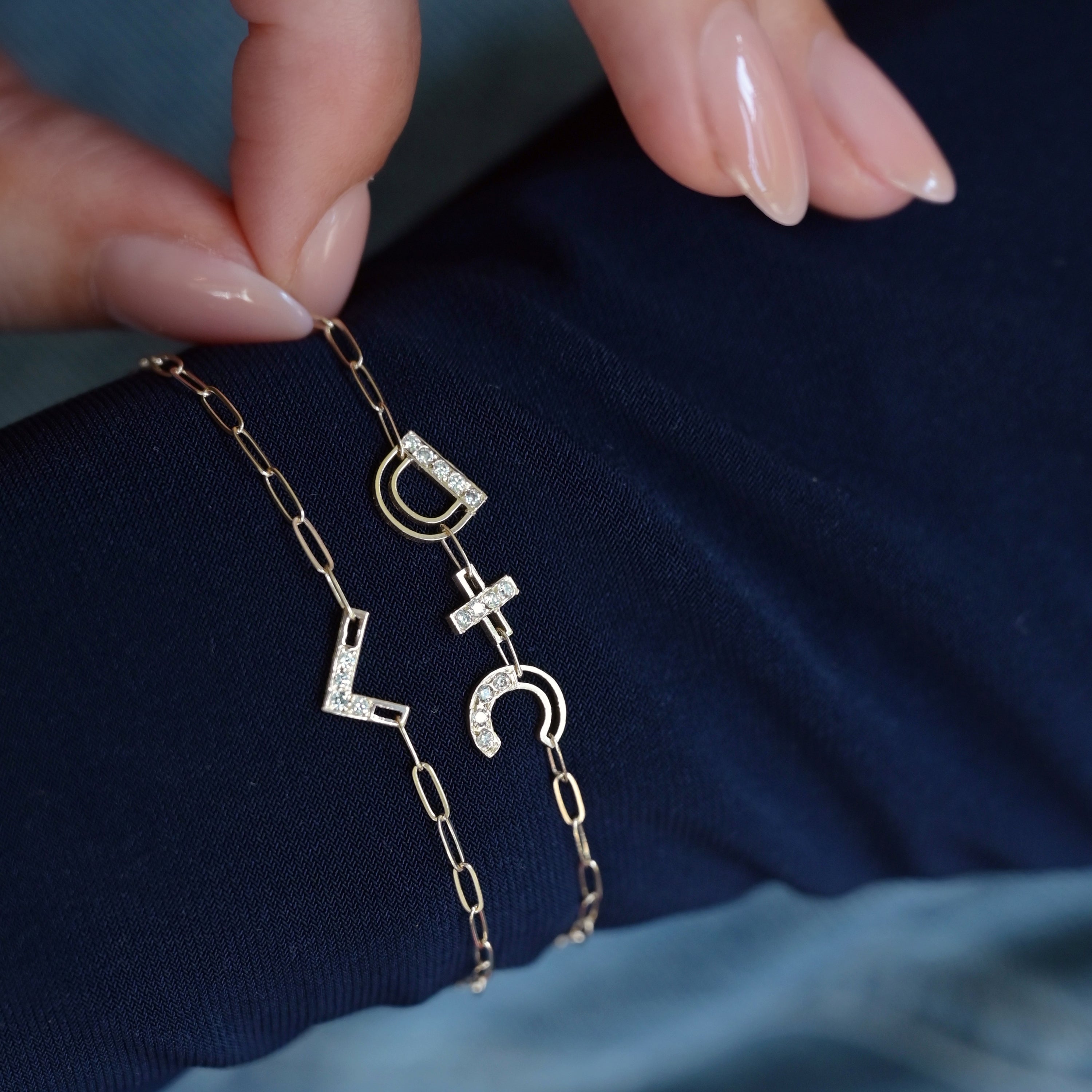 Our best selling bracelet now in diamonds! Solid gold letters are designed to look, move, and function like links in the chain.
