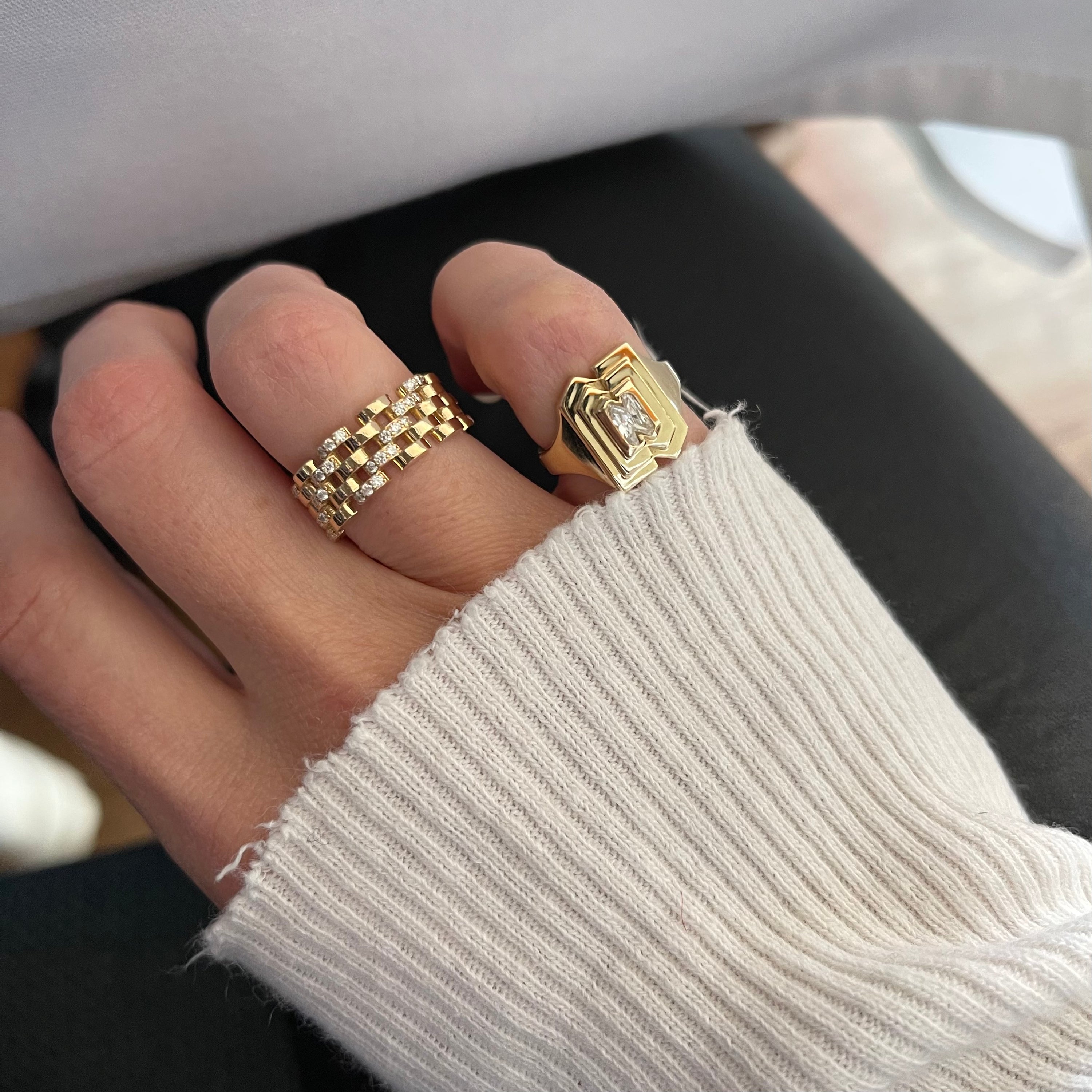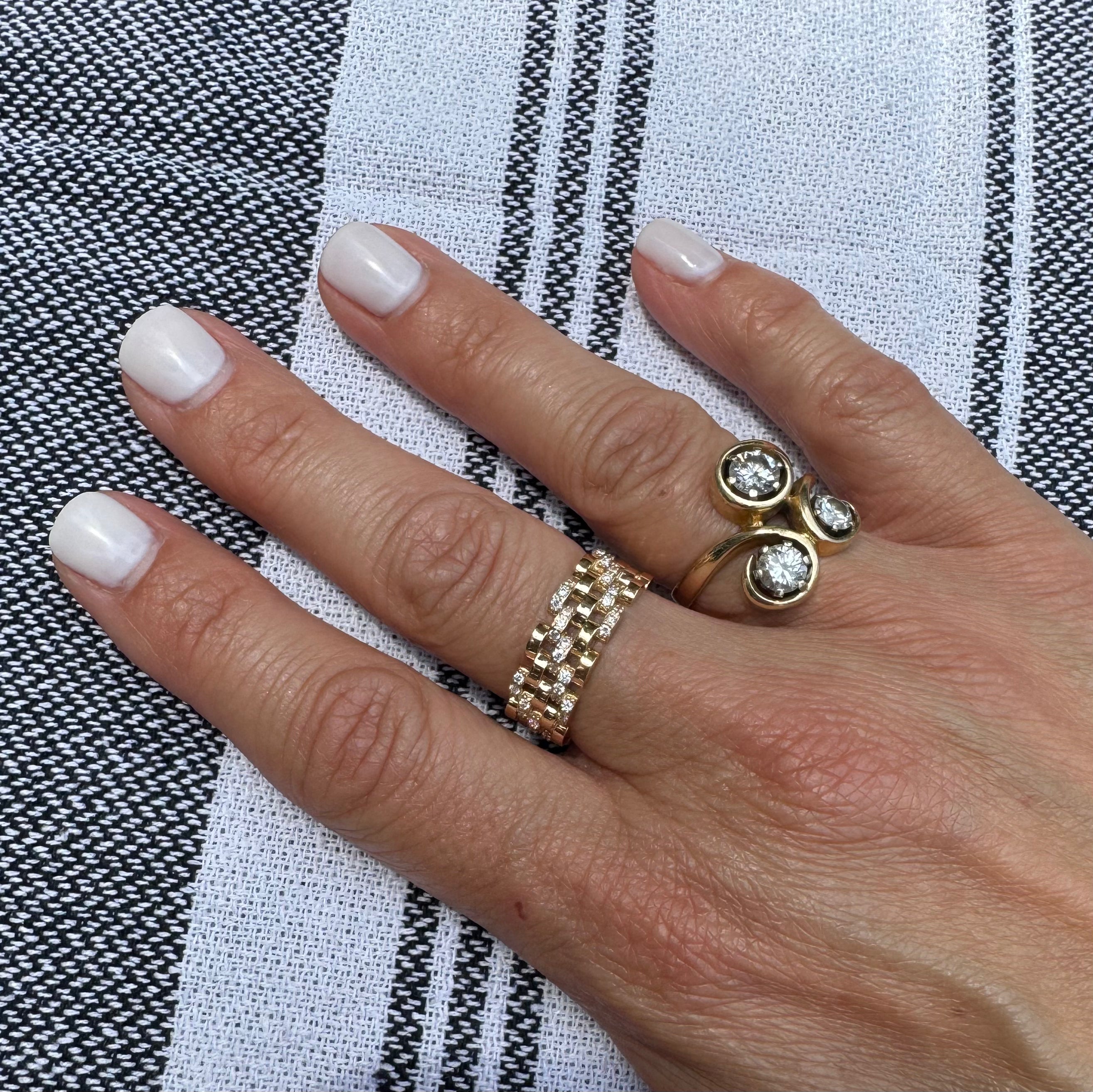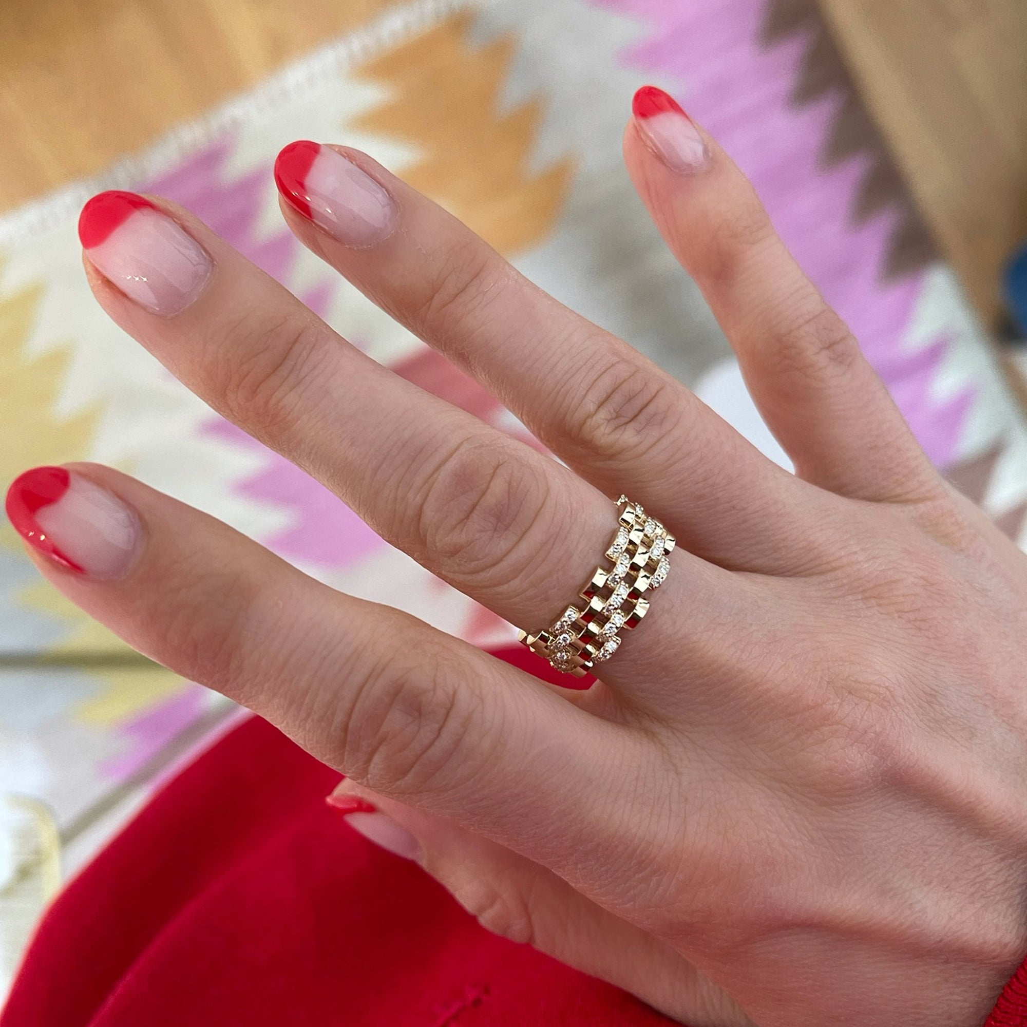 The classic cotton friendship bracelets of our youth, reimagined in an heirloom quality ring that can be worn year-round, for years to come. Solid 14k gold with meticulously set diamonds in three different patterns.