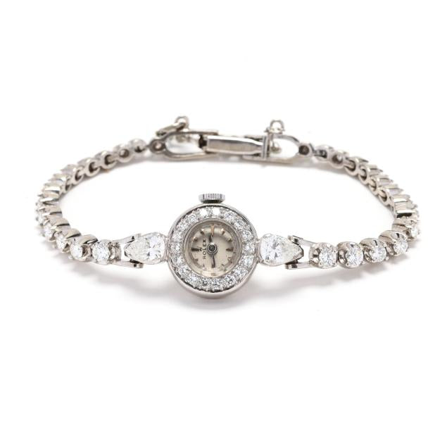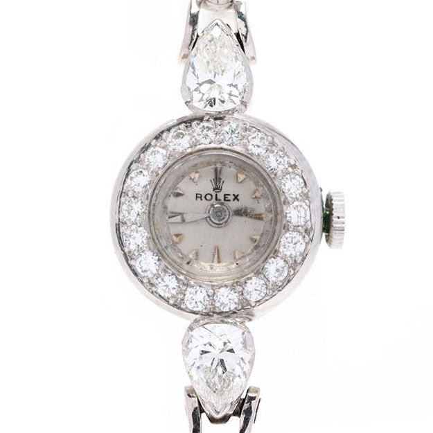This manual-wind vintage Rolex wristwatch features a movement caliber 1401, with 17 jewels. The round case is set with round brilliant-cut diamonds, flanked by two ~6.2mm x 4.3mm pear-shaped diamonds at 12 o'clock and 6 o'clock. The tapered diamond bracelet is set with prong-mounted round brilliant-cut diamonds, and the silver dial is branded, with lozenge-shaped hour markers and matching hands. The watch is completed with a fold-over clasp, stamped "14K," and a safety chain.