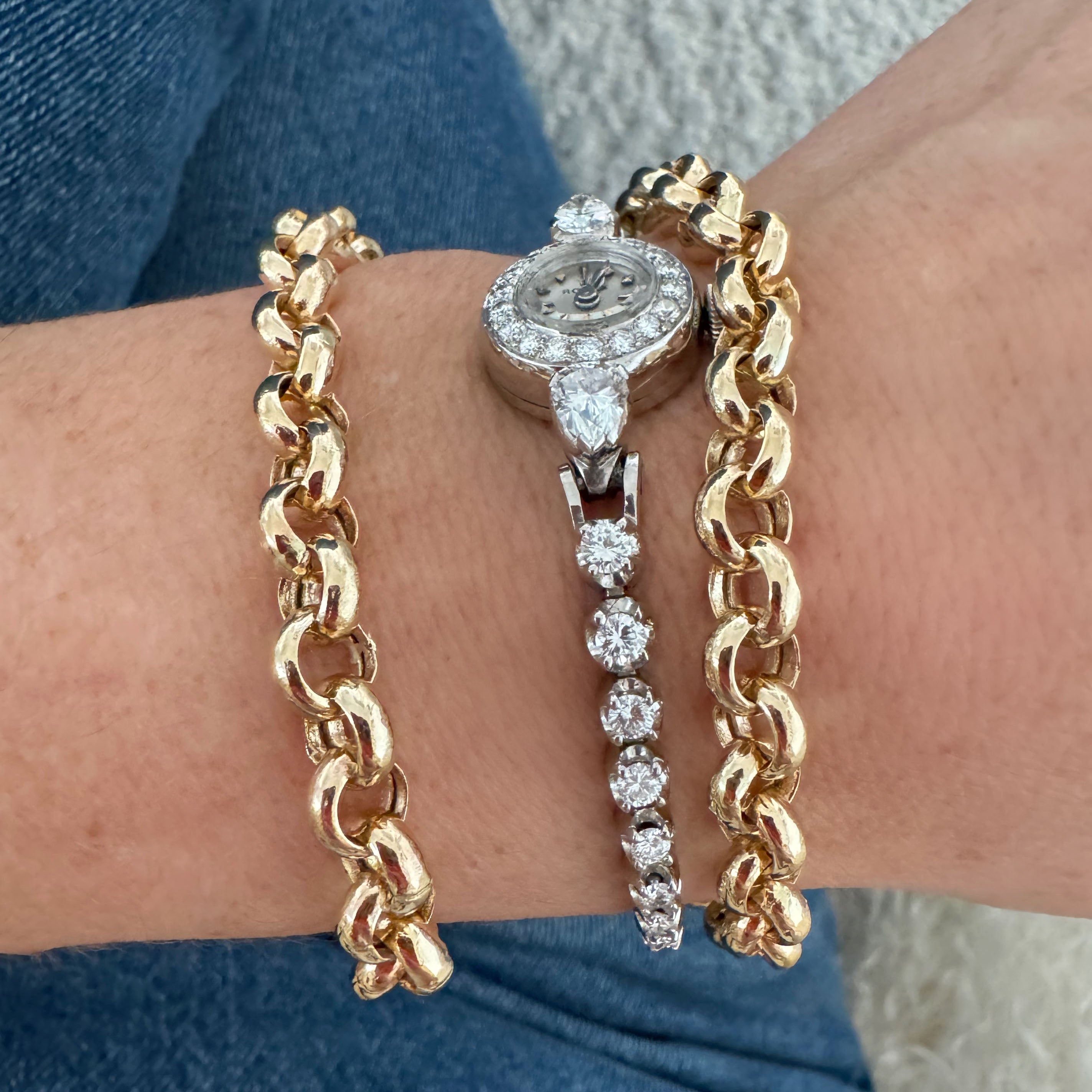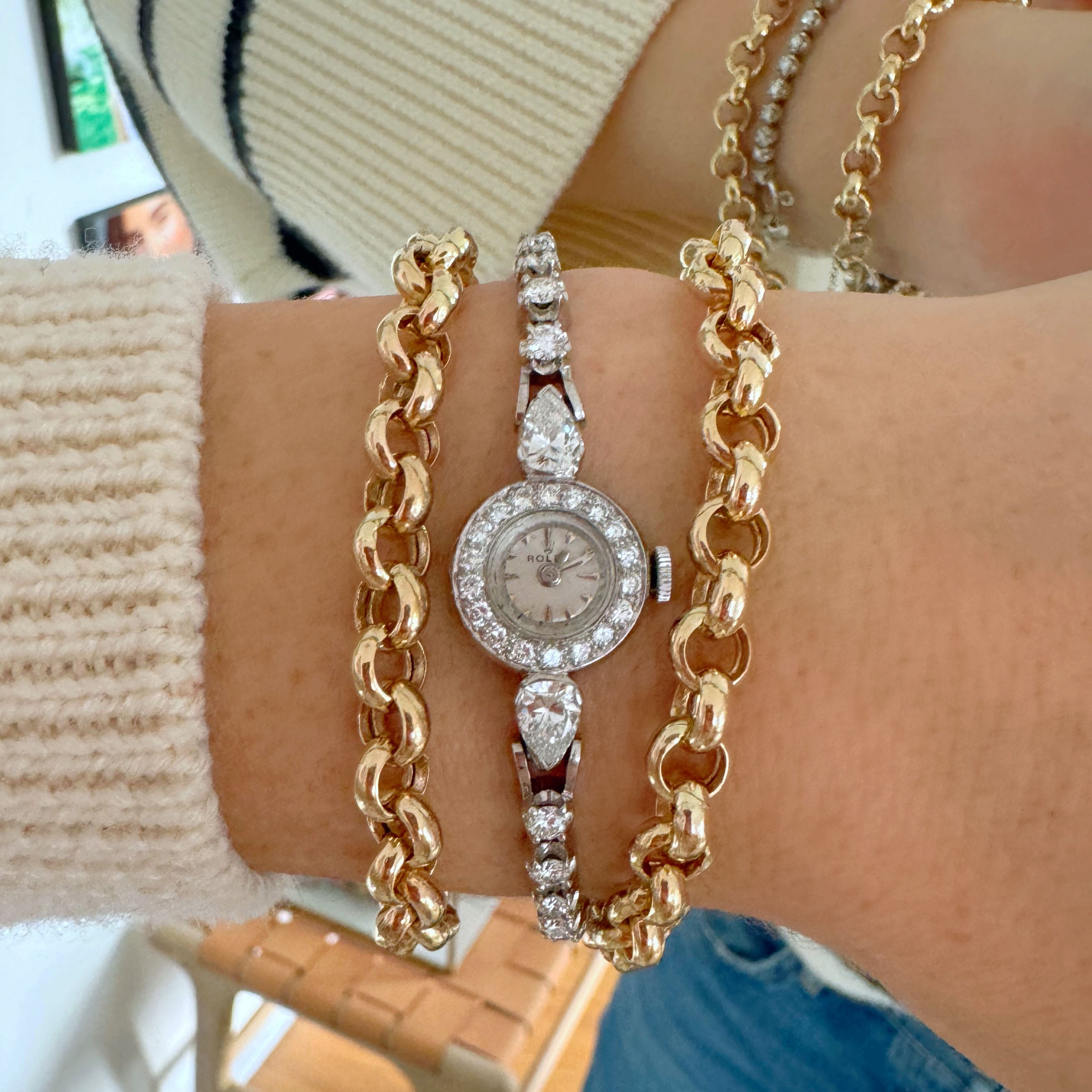 The latest piece in our KK Curated Vintage Collection, this highly unique vintage diamond bracelet Rolex watch has been restyled to maximize and modernize its one-of-a-kind beauty. You can wear this diamond watch on its own, or as we've modernized it, with a double-wrap 14k gold rolo chain. The double-wrap gold bracelet chain may also be detached and worn separately.