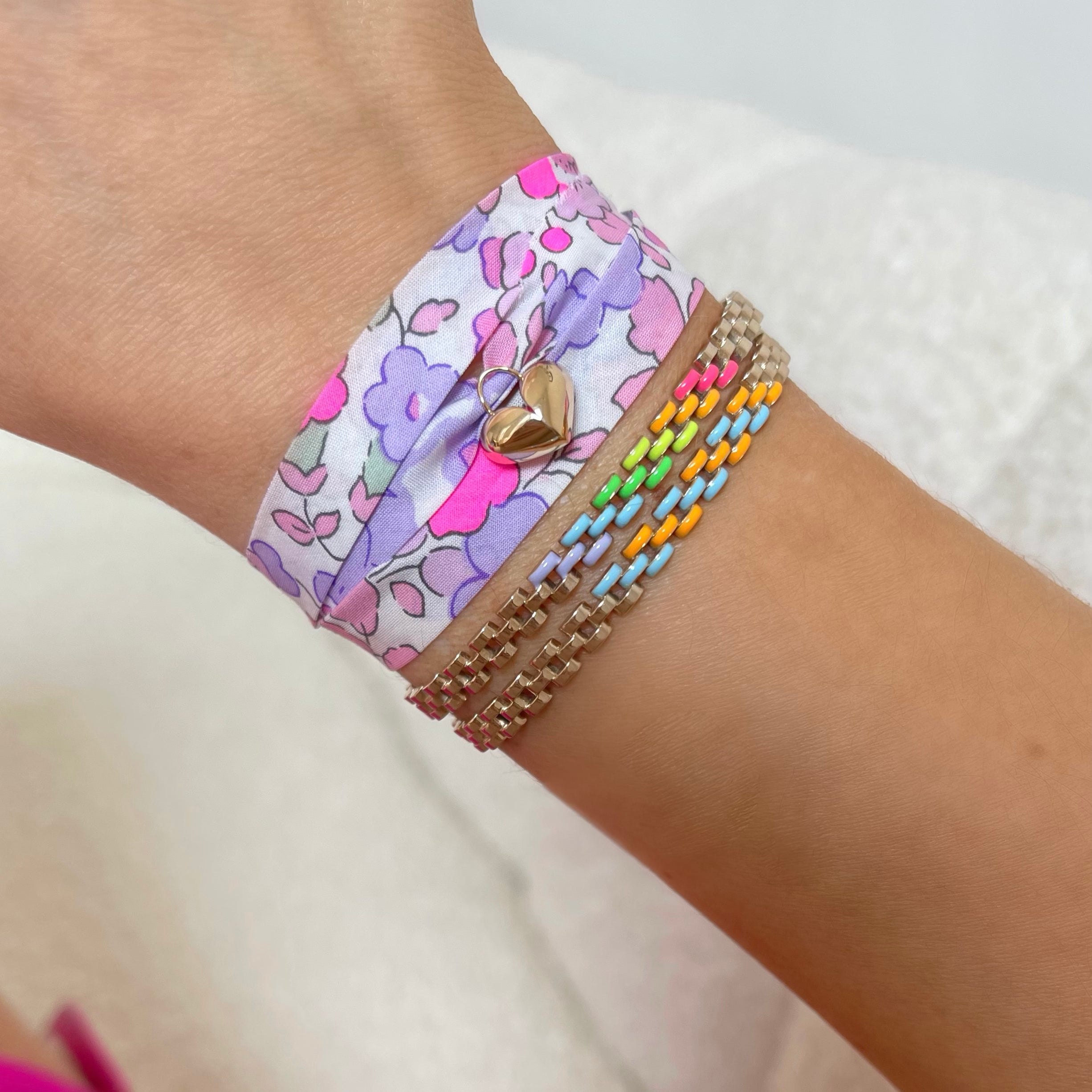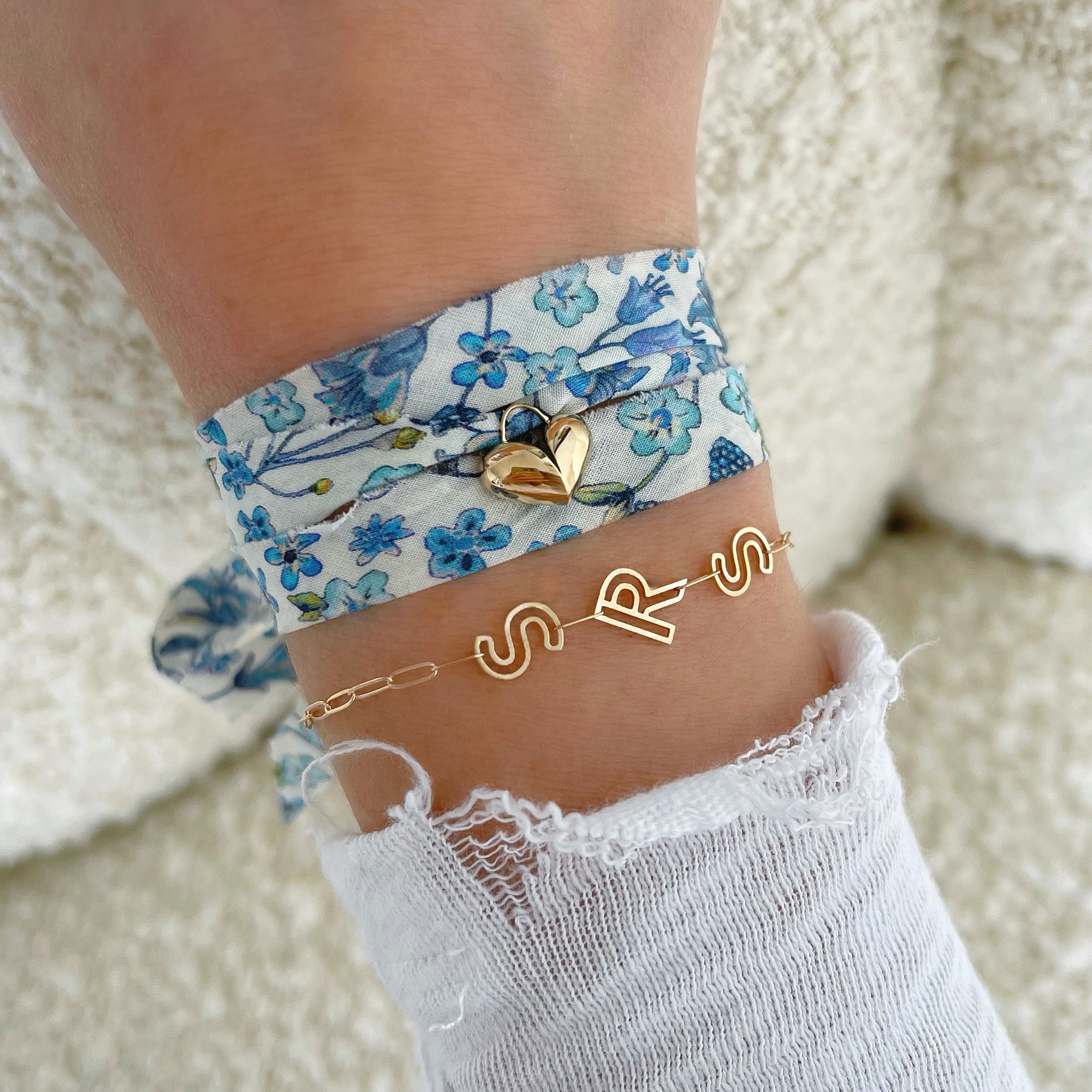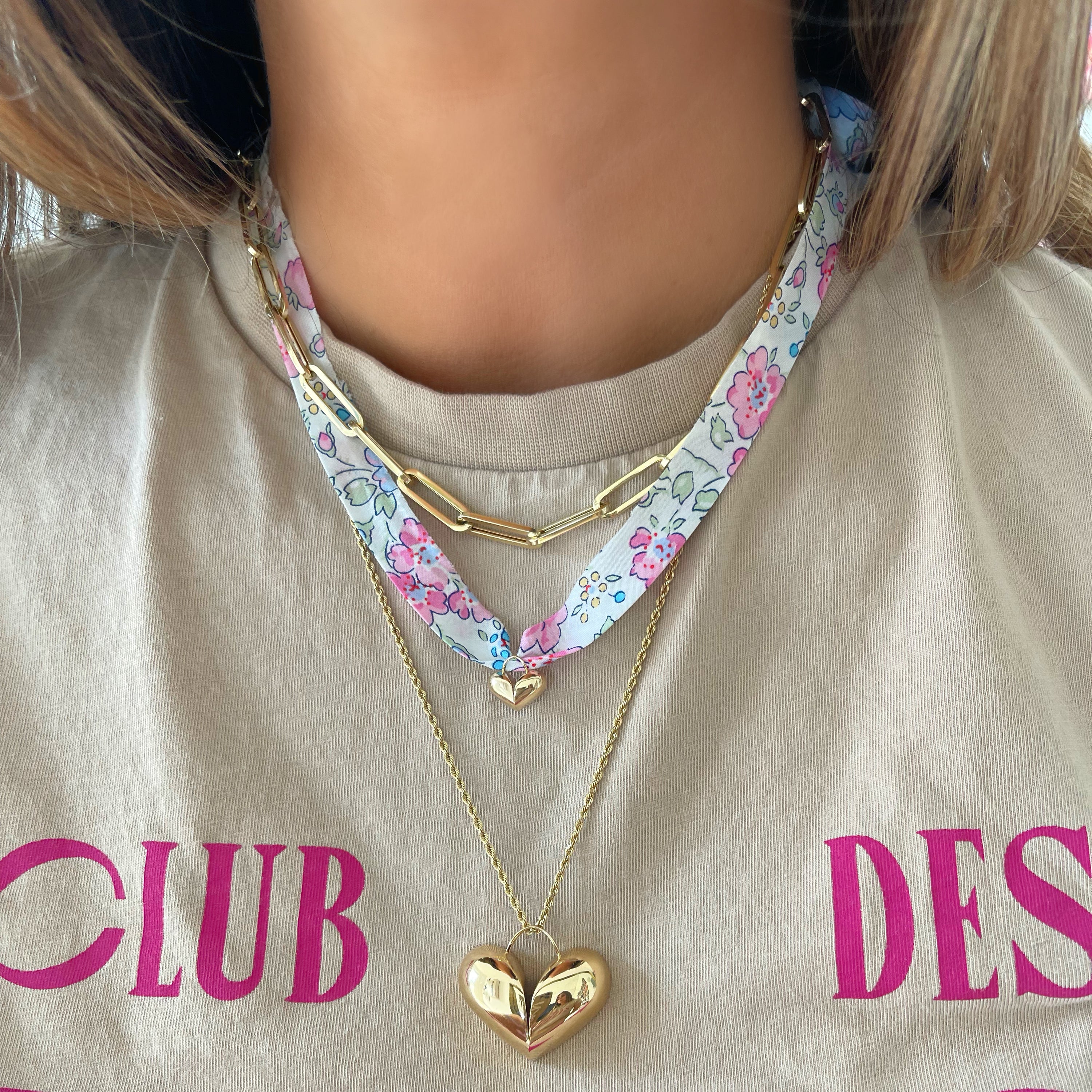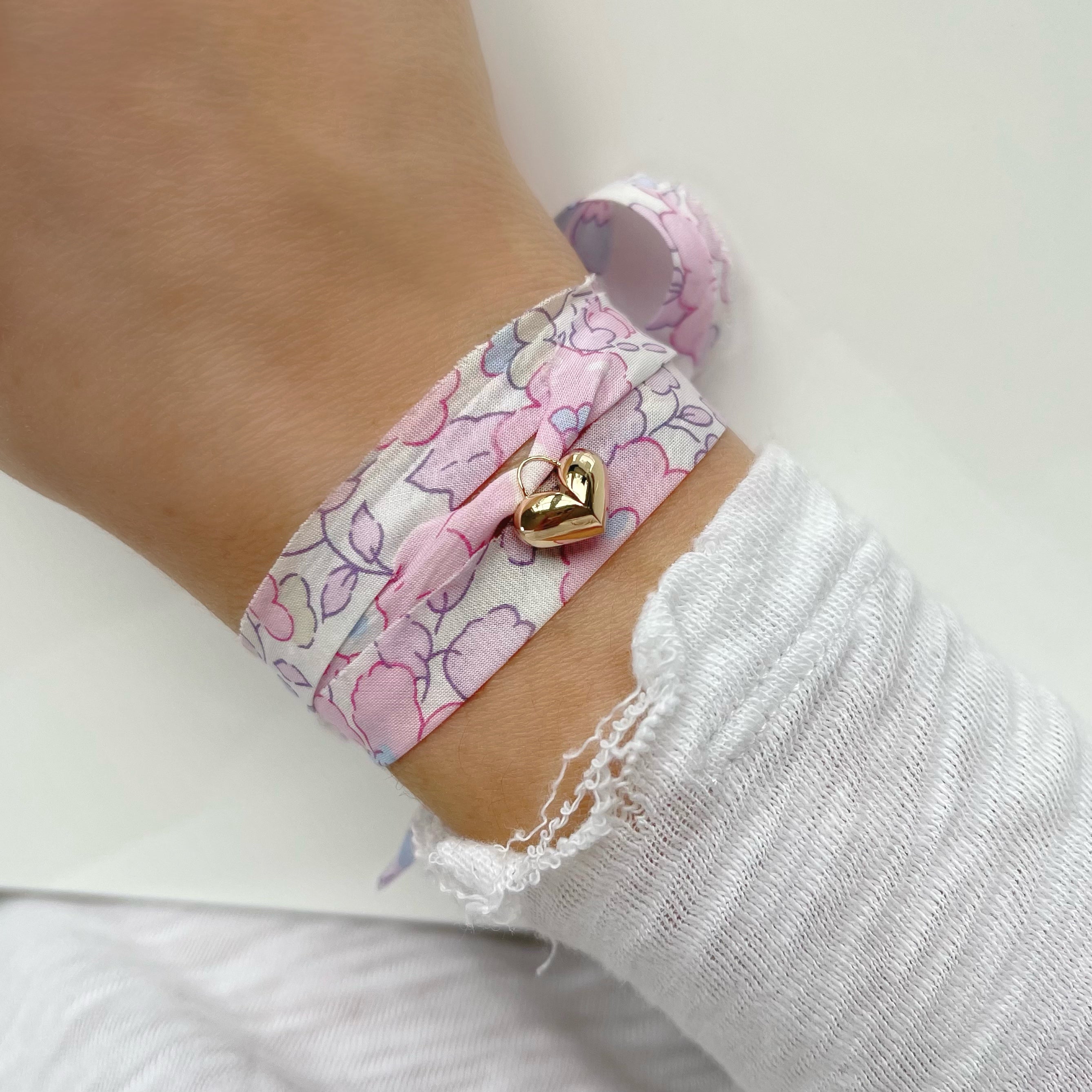 14k Yellow Gold Heart (12mm wide) Charm on a ~34" Liberty Print Ribbon. Tie on style that can be worn at any length as a necklace. We recommend wrapping the ribbon 3x as a bracelet.