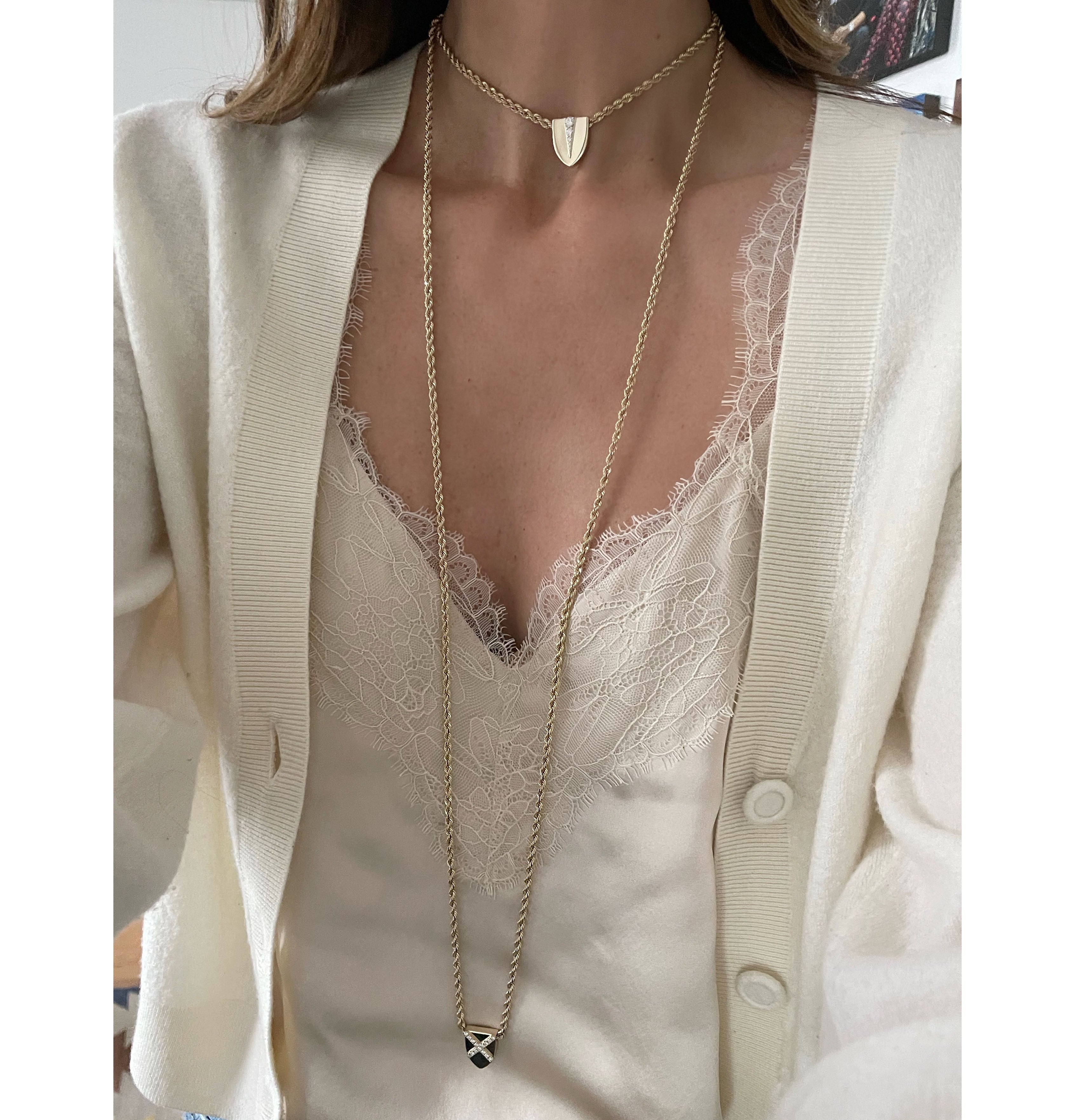 Radiating with romance and power, our Golden Age Collection was inspired by the jewelry and armor of the Elizabeth Era, AKA The Golden Age. Choose from 7 different shield meanings with an option to engrave the back. 55" or 60" chains are designed to be convertible and worn in many different ways!