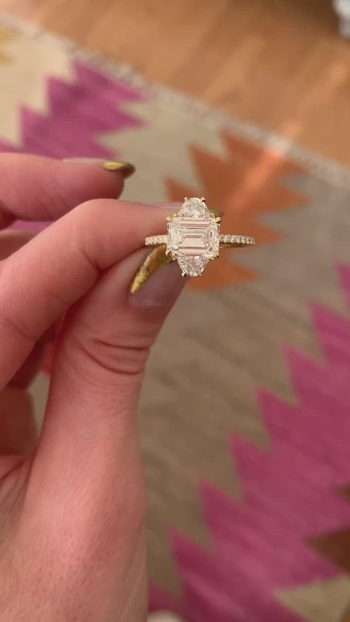 Words can’t express how beautiful and exquisite this ring is. Love everything about it: the setting with the center stone elevated, quality of the diamonds, contrast between the emerald and half moon brilliant cuts, and delicate pave band. I get compliments everywhere. My husband loved working with Kate on the ring. If you’re looking for a combination of modern, traditional, graceful, and both emerald and round cuts in one – then this is the perfect ring for you or your loved one!