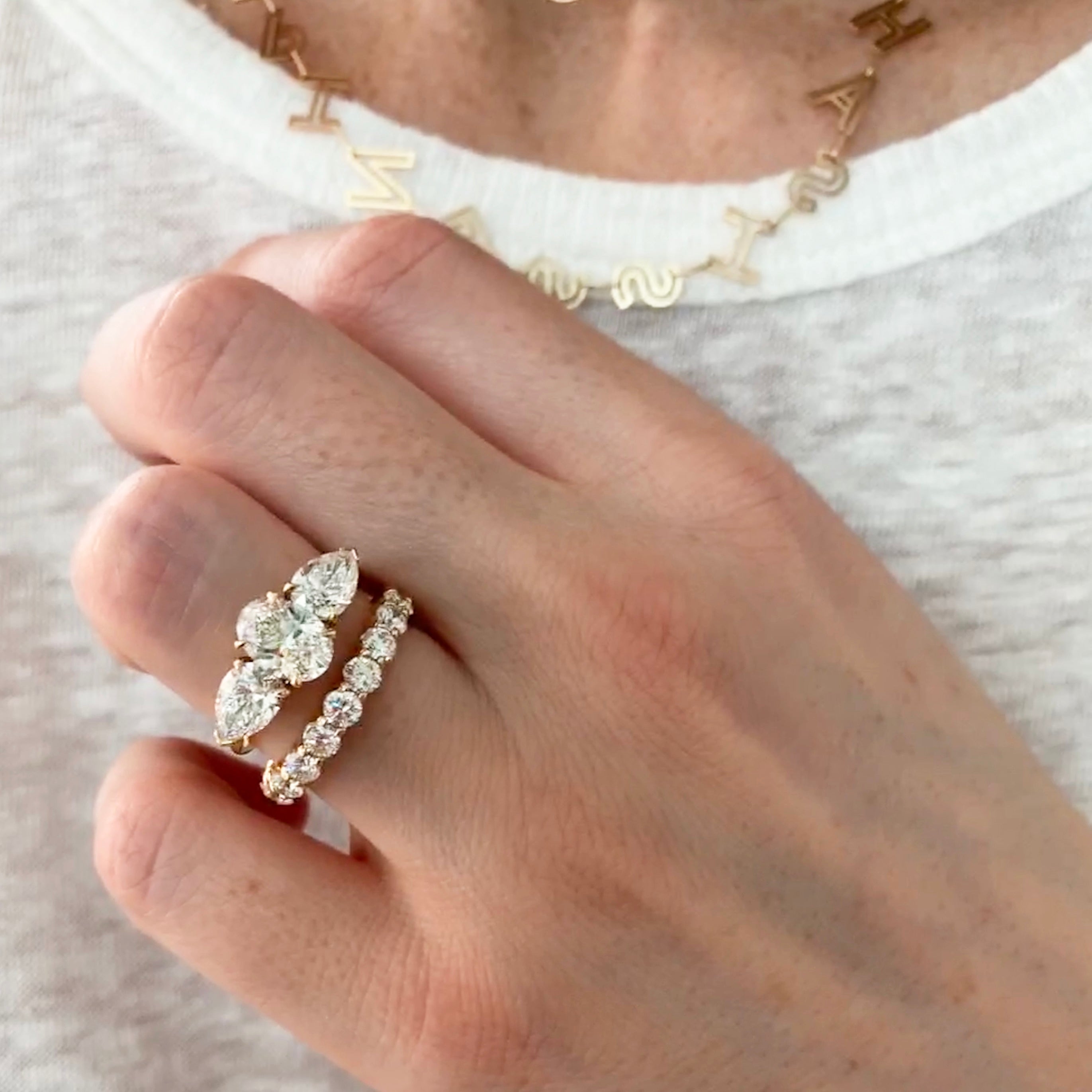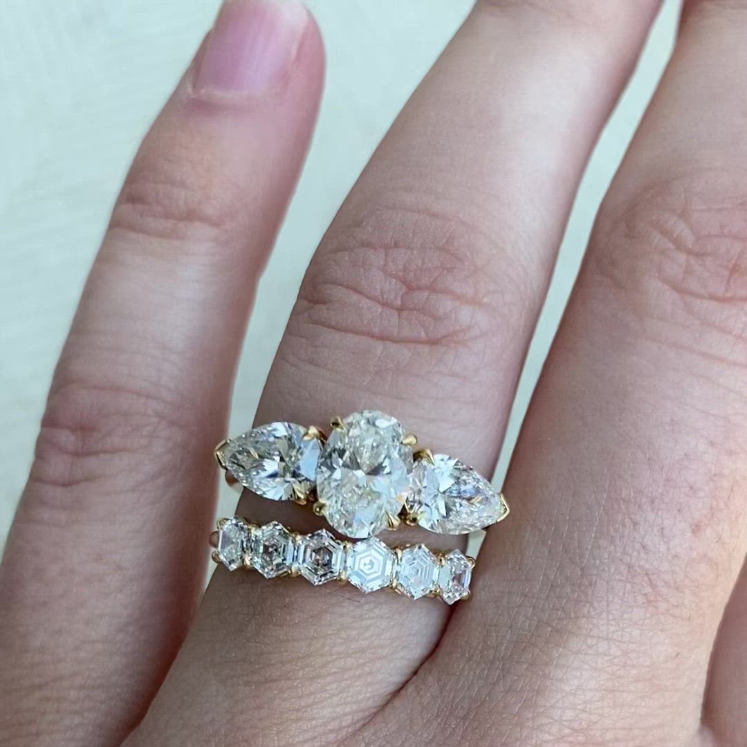 We only work with diamonds that have been independently graded and certified by the GIA, and that come from conflict free sources. The diamonds in our rings generally fall within the D-H color, VS2+ clarity range (with the occasional SI1 depending on cut!). WITH THAT SAID - we are firm believers that a diamond’s “off paper” characteristics, meaning the ones that are not officially “graded”, are just as important to its beauty as the graded ones. A stone can have amazing graded characteristics but be lacking character in person! This is why we always recommend working with an expert you trust when buying a diamond, vs. purchasing one over the internet.